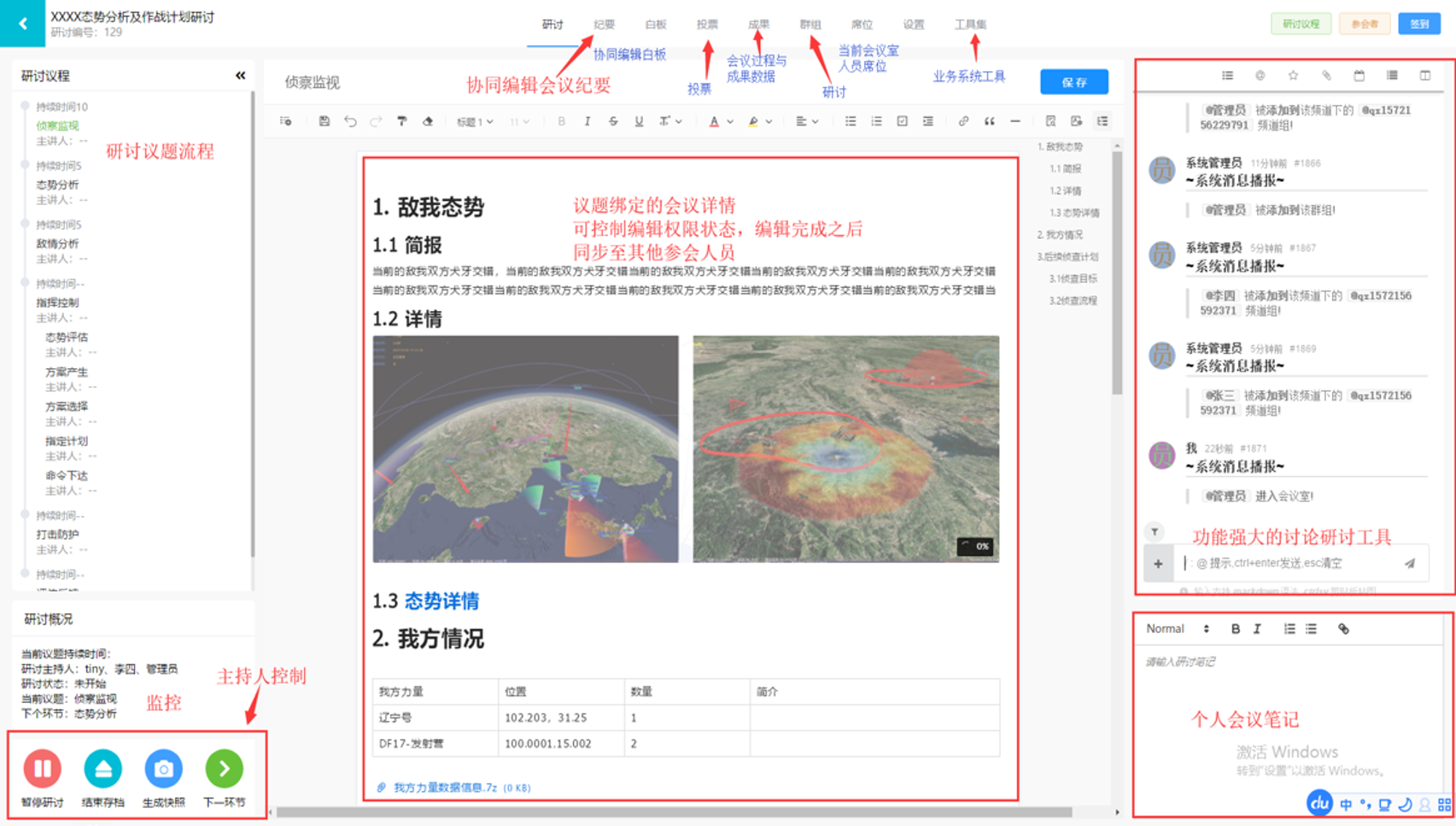 以高層研討廳、低層研討廳、作戰(zhàn)模擬與訓練演習為研究對象,根據(jù)軍事戰(zhàn)爭需要,以軍事任務為牽引,組成結構為基礎,對每個組成部分進行功能需求分析,建設成一個具有功能相對完善、結構相對完整,各部分關系相互協(xié)調的研討廳體系。