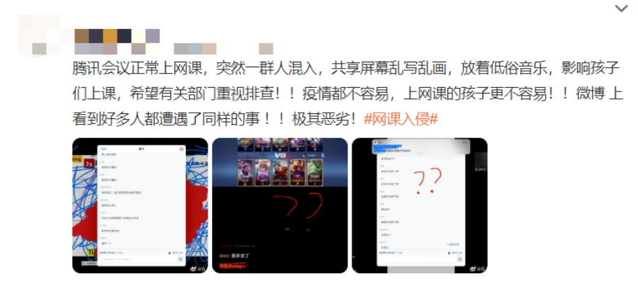 學生通過騰訊會議、釘釘?shù)绕脚_上網課時,突然有一些陌生人涌入直播間,有人謾罵老師和學生,有人放哀樂,甚至散發(fā)淫穢色情視頻。