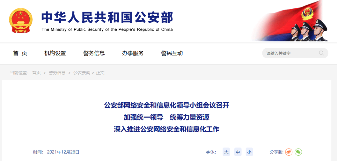 12月25日,公安部網(wǎng)絡(luò)安全和信息化領(lǐng)導(dǎo)小組會(huì)議召開。國務(wù)委員、公安部部長、部網(wǎng)絡(luò)安全和信息化領(lǐng)導(dǎo)小組組長趙克志主持會(huì)議并發(fā)表講話。會(huì)議強(qiáng)調(diào),要深入貫徹落實(shí)習(xí)近平總書記關(guān)于網(wǎng)絡(luò)安全和信息化工作的重要指示精神,增強(qiáng)“四個(gè)意識(shí)”、堅(jiān)定“四個(gè)自信”、做到“兩個(gè)維護(hù)”,加強(qiáng)統(tǒng)一領(lǐng)導(dǎo),統(tǒng)籌力量資源,進(jìn)一步推進(jìn)公安網(wǎng)絡(luò)安全和信息化工作,更好履行新時(shí)代黨和人民賦予的職責(zé)使命。